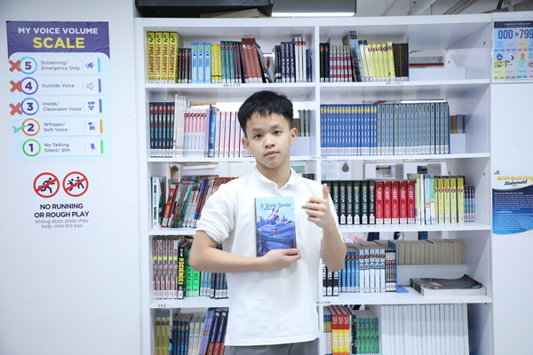 Ideas came to him naturally, supported by the rich vocabulary and expressive language he accumulated through his reading habit. Dũng shared that he has never faced language barriers. From primary school, he became accustomed to presenting in English and using the language as a tool for self-learning, research, and classroom projects. “In every English lesson, our teacher usually sets aside 10 minutes for reading and discussion. Instead of approaching knowledge purely through textbooks, Humanities topics are connected to specific books, giving us opportunities to reflect and develop our own understanding,” Dũng explained.