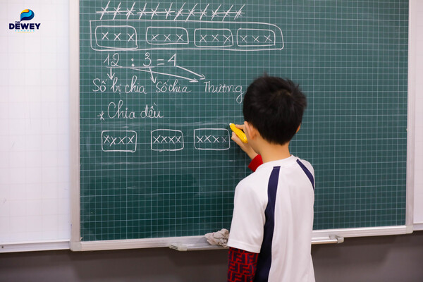 In a Grade 2 Mathematics lesson at The Dewey Schools, students are guided to retrace the journey of scientists in discovering division. Starting with the same task—sharing 12 mangoes equally among four plates—students begin by working with their hands. The 12 mangoes are represented by 12 blocks, and the four plates by four circles drawn on the whiteboard. First, the student picks up four blocks and places one block into each circle. The process is repeated a second time, then a third. When there are no blocks left on the table, the student concludes that each circle contains three blocks. In this way, the student learns the operation and concept of equal sharing and independently arrives at the result 12 ÷ 4 = 3, instead of being answered something taken for granted.