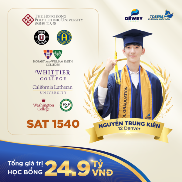 Tại Dewey, Kiên học cách tin vào chính mình, học cách lắng nghe, biến những cơ hội được trao thành giá trị tích cực tới cộng đồng. Cùng với thành tích học thuật xuất sắc, em đã ghi danh vào hơn 14 trường đại học trên thế giới, trong đó có Hong Kong Polytechnic University – Top 54 trường đại học hàng đầu toàn cầu. Trên hành trình phía trước, Kiên ấp ủ ước mơ theo đuổi lĩnh vực kỹ thuật điện và máy tính. Với tinh thần không ngại trải nghiệm, không ngừng bứt phá, Dewey tin rằng em sẽ mang tri thức và sự tử tế lan tỏa tới cộng đồng theo cách rất riêng của mình.