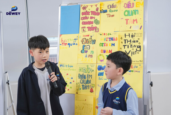 Tại dự án “Điều em quan tâm”, những chủ đề tưởng chừng phức tạp như “Vì sao xảy ra chiến tranh?”, “Học thêm có thực sự tốt?” hay “Tại sao chúng ta cần học nhiều ngôn ngữ khác nhau?” đã được các học sinh lớp 4 bóc tách một cách mạch lạc, đi từ quan sát cá nhân đến dẫn chứng cụ thể. Mỗi bài thuyết trình không chỉ cho thấy khả năng sử dụng văn bản nghị luận, mà còn phản ánh cách các em suy nghĩ về thế giới xung quanh bằng chính trải nghiệm sống của mình.