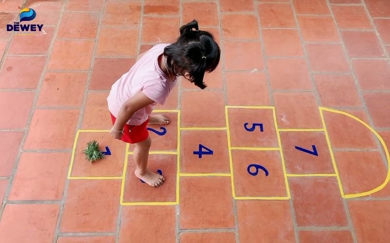 Cách chơi: Trong trò chơi ngoại khóa này, người lớn sẽ dùng phấn vẽ các ô vuông liên tiếp trên nền đất và đánh số theo thứ tự. Trẻ bắt đầu đứng tại vạch xuất phát, sau đó lần lượt nhảy lò cò vào từng ô theo đúng số thứ tự đã vẽ. Khi trẻ đã quen, phụ huynh có thể nâng độ khó bằng cách yêu cầu nhảy vào một ô bất kỳ hoặc bổ sung thêm nhiều ô có số lớn hơn. Nhờ vậy, trò chơi không chỉ tạo hứng thú mà còn giúp trẻ rèn luyện khả năng ghi nhớ và tập trung.
